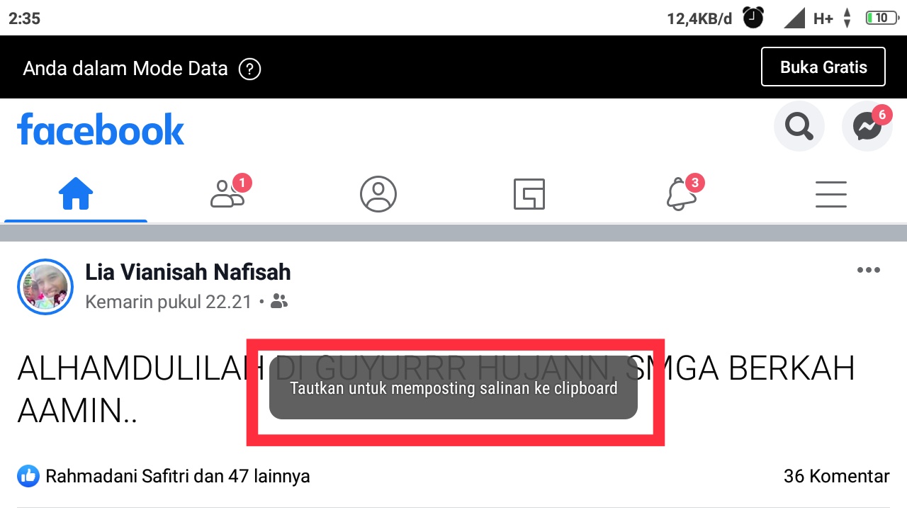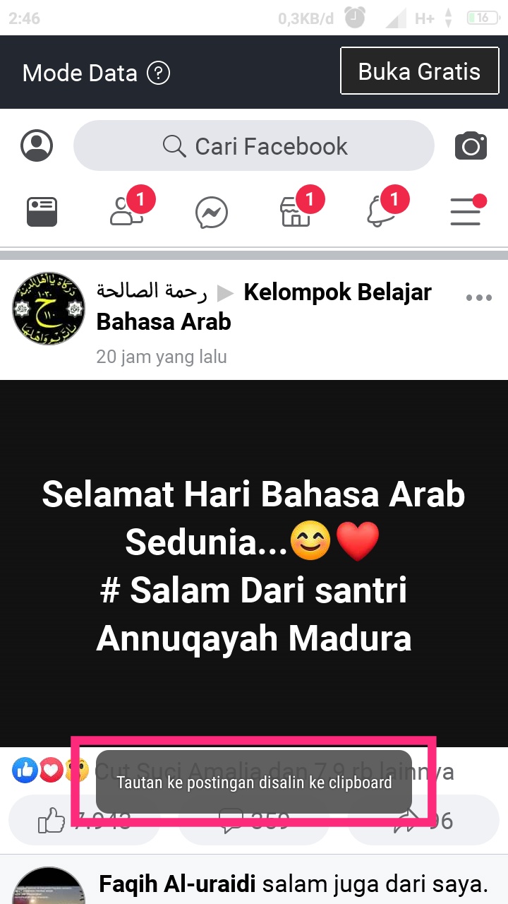 Terdapat notifikasi pop up bahwa tautan ke postingan di salin ke clipboard. Ini menandakan bahwa kalian telah berhasil.