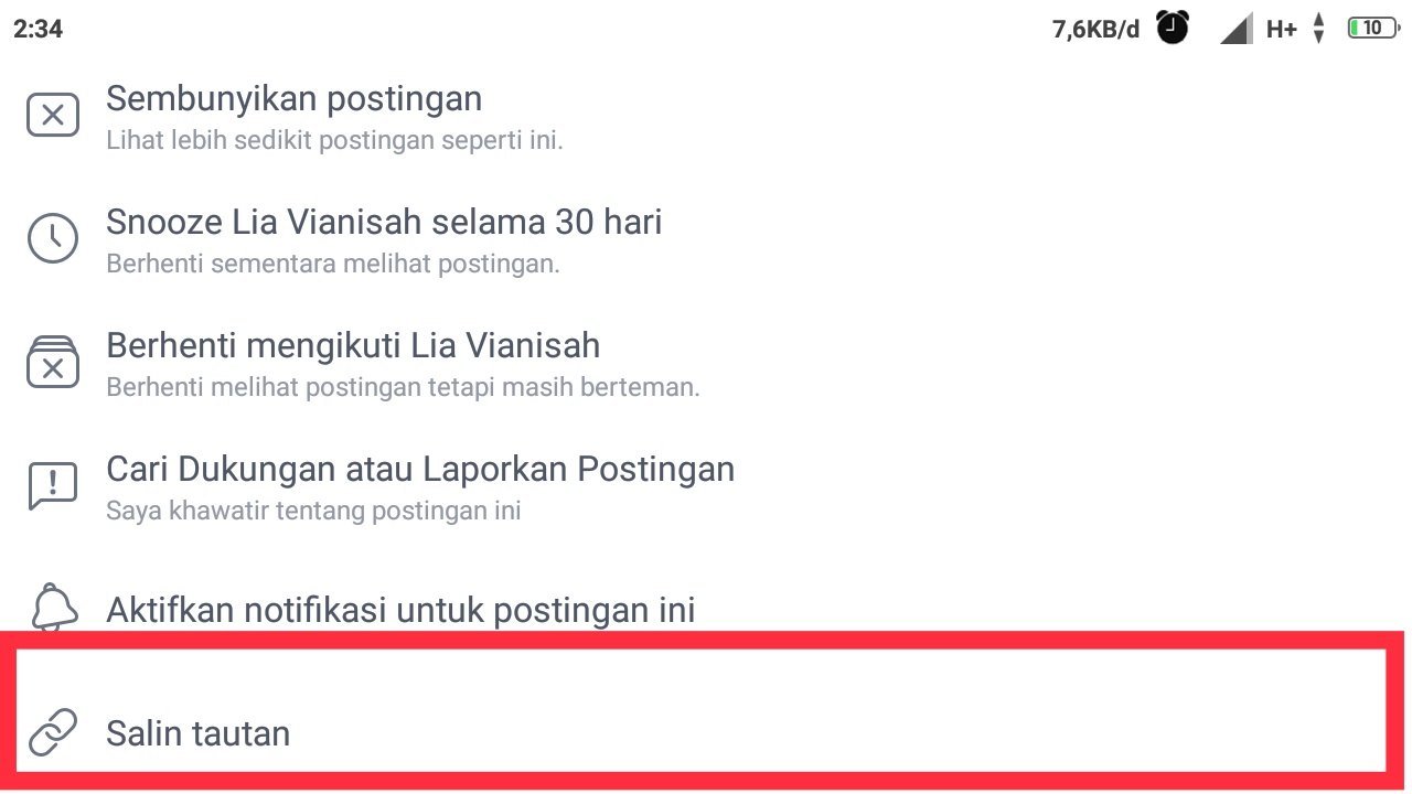 Terdapat beberapa pilihan, tetapi pilih yang salin tautan untuk melanjutkan proses copy link Fb ini.