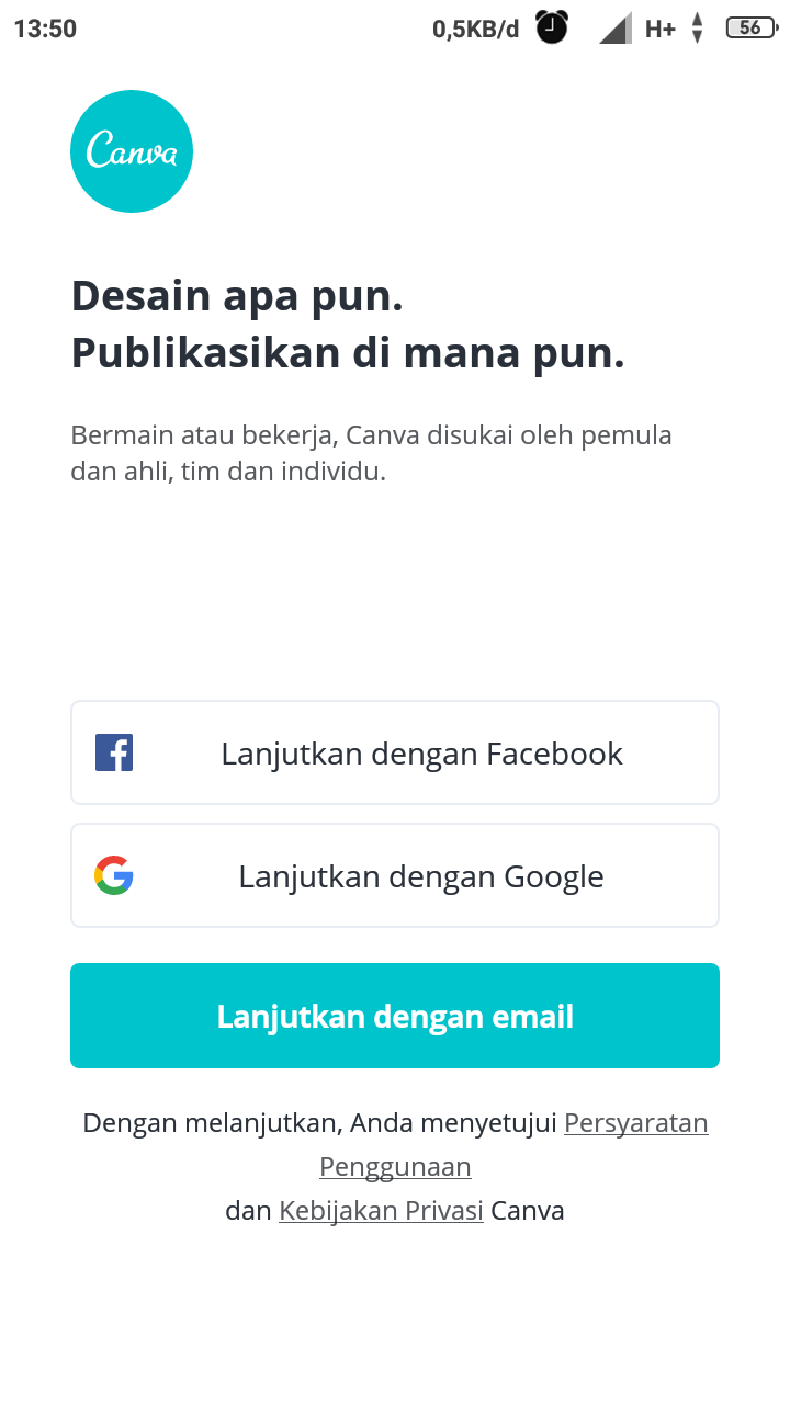- Buka aplikasi canva dan lanjutkan dengan email atau Facebook